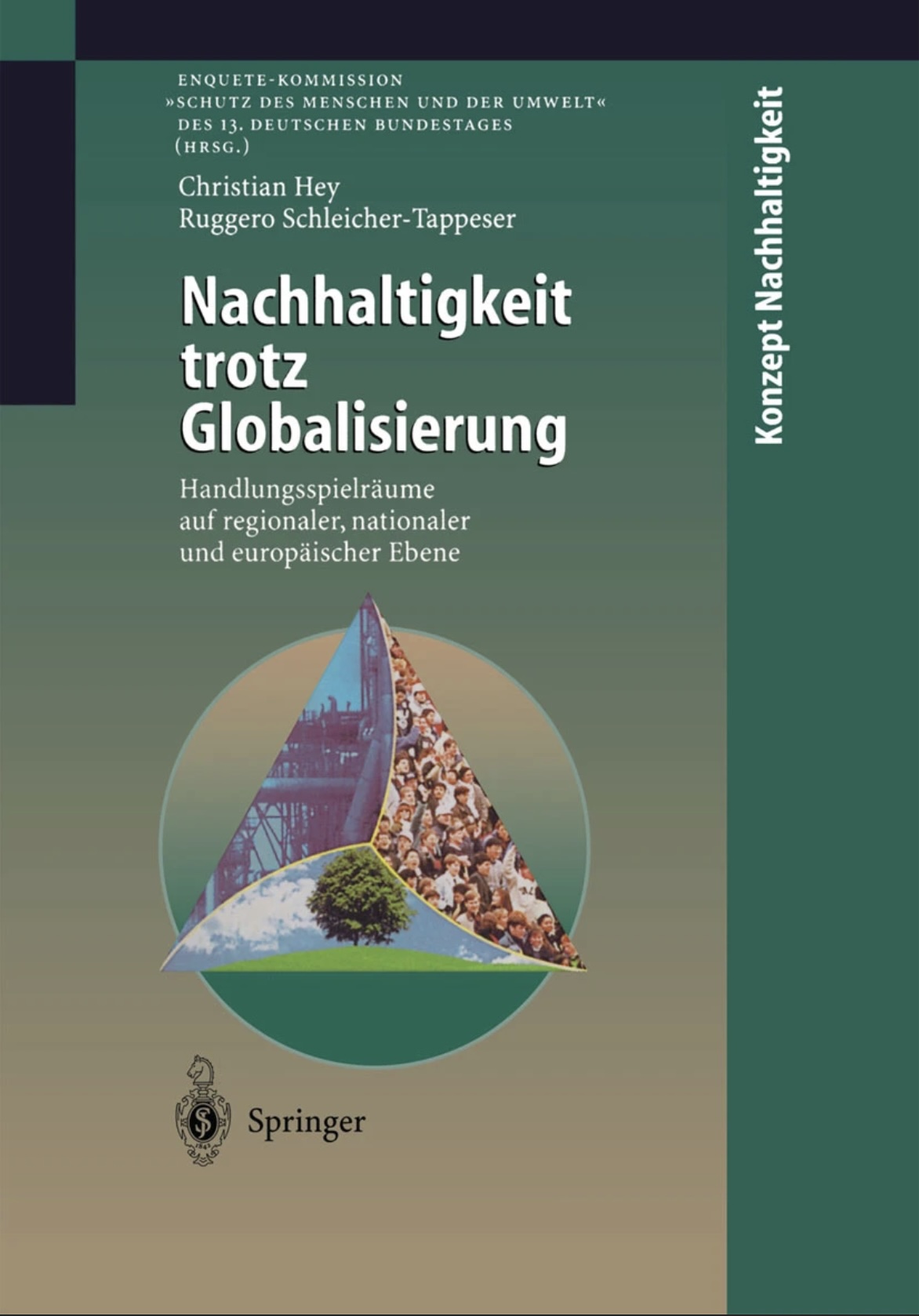 Hey, Christian / Schleicher-Tappeser, Ruggero (1998): Nachhaltigkeit trotz Globalisierung. Handlungsspielräume auf regionaler, nationaler und europäischer Ebene. Heidelberg / Berlin / New York: Springer Verlag.